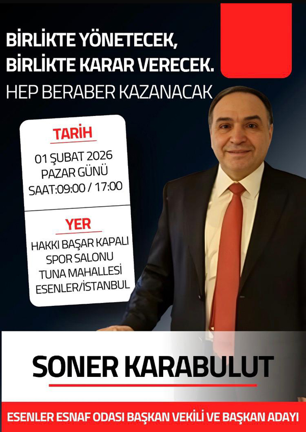 1 Şubat Pazar günü saat 09.00’da Esenler Tuna Mahallesi Hakkı Başar Spor Salonu’nda yapılacak olan Esenler Esnaf ve Sanatkârlar Odası seçimleri için yaklaşık 6 ay önce başkan adaylığını açıklayan Soner Karabulut, seçim süreci kapsamında projelerini, hedeflerini ve çalışma planını basın mensuplarıyla paylaştı.